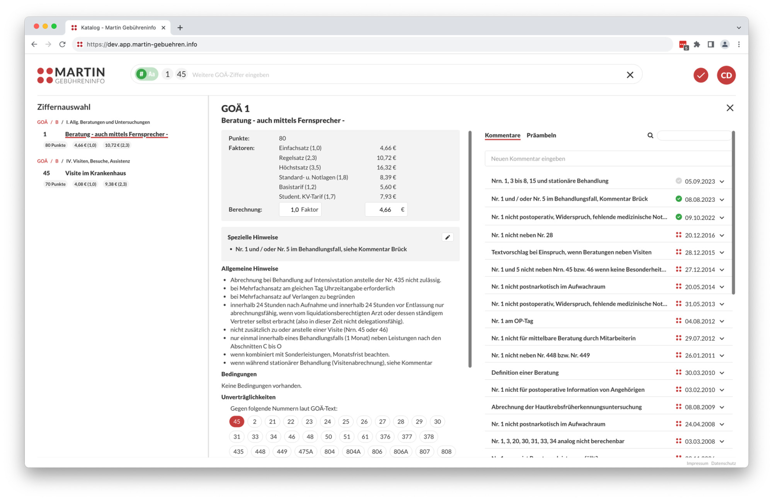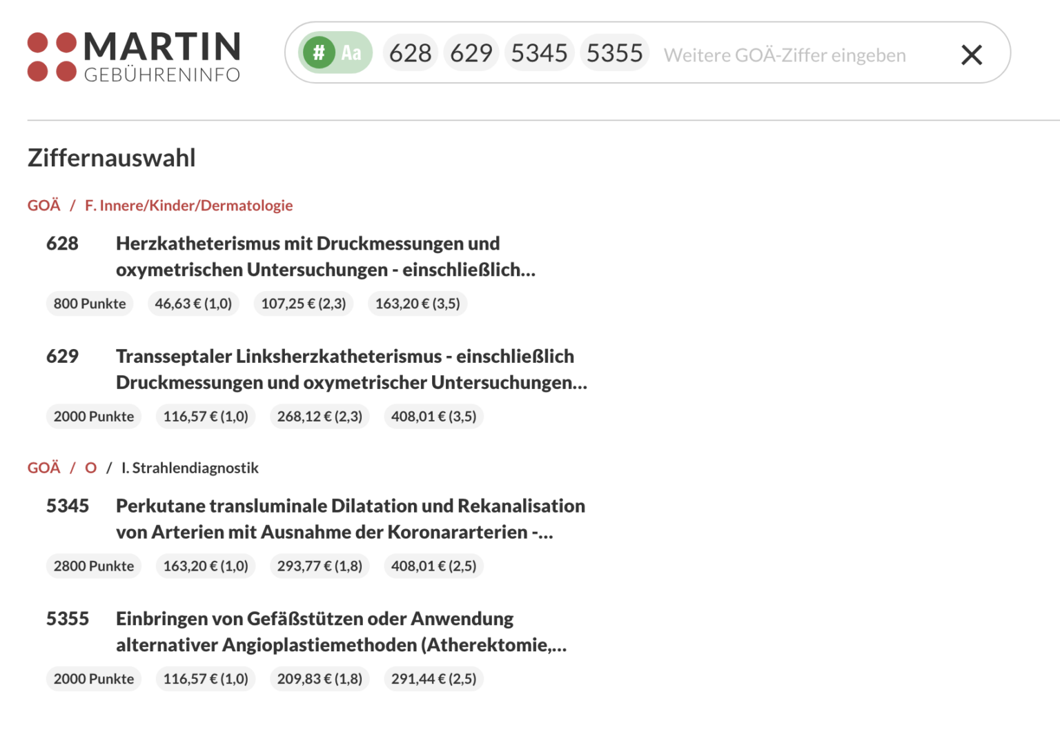 Suchen Sie nach einer oder mehreren GOÄ-Ziffern gleichzeitig. Verschaffen Sie sich leicht einen Überblick anhand des GOÄ-Katalogs.