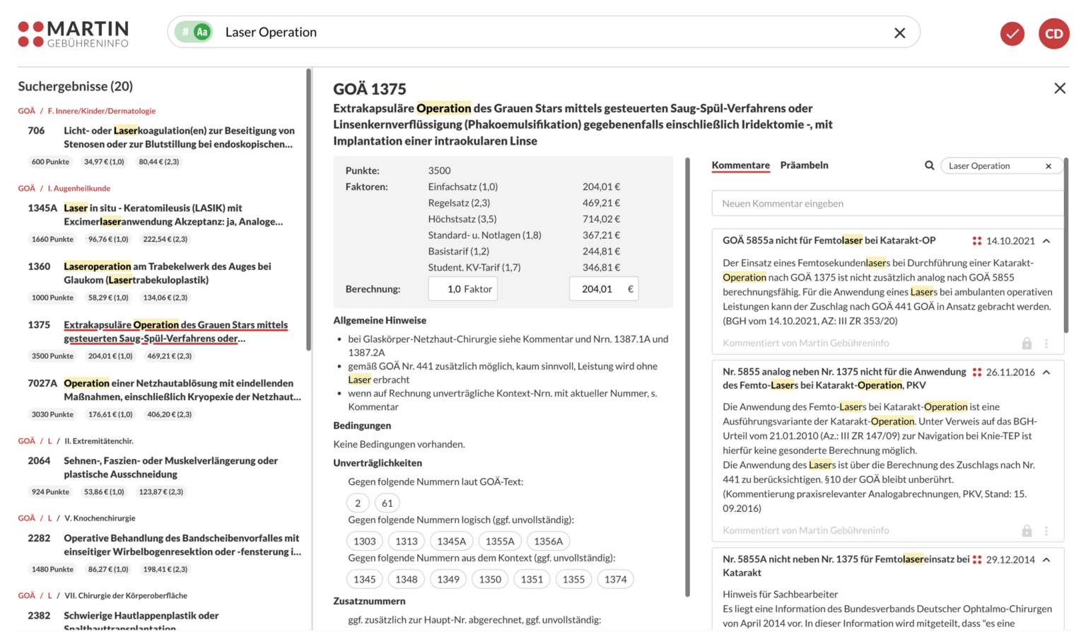 Martin Gebühreninfo wurde speziell für private Krankenversicherer und Beihilfestellen entwickelt, die Hilfe bei der Prüfung strittiger Rechnungen nach GOÄ brauchen und zu viel Zeit damit verbringen, Wissen an verschiedenen Orten zu suchen.