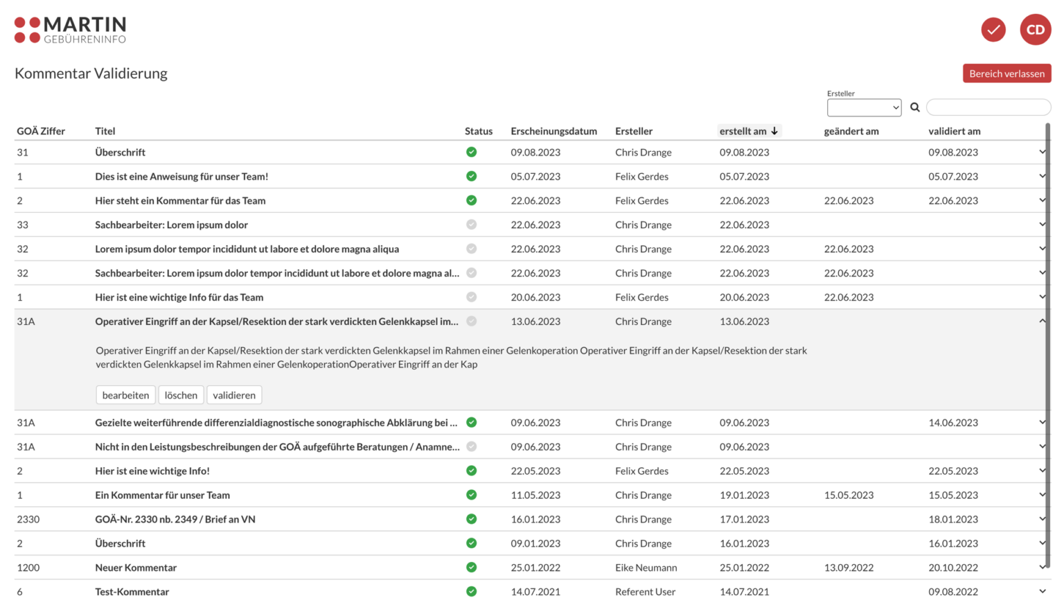 Um die Prüfung von Arztrechnungen und die Bearbeitung von Widerspruchsfällen möglichst Zeitsparend zu gestalten, haben wir Martin Gebühreninfo bewusst als erweiterbare Wissesmanagment-Anwendung konzipiert. Damit die Erweiterung der Inhalte durch Ihre Mitarbeiter kontrolliert und qualitätsgesichert realisiert werden kann, enthält jeder Nutzer eine der Rollen, Sachbearbeiter, Referent oder Moderator. Kommentare, oder auch Arbeitsanweisungen und Musterbriefe können je GOÄ-Ziffer von den Rolleninhabern Referent oder Moderator erfasst werden.